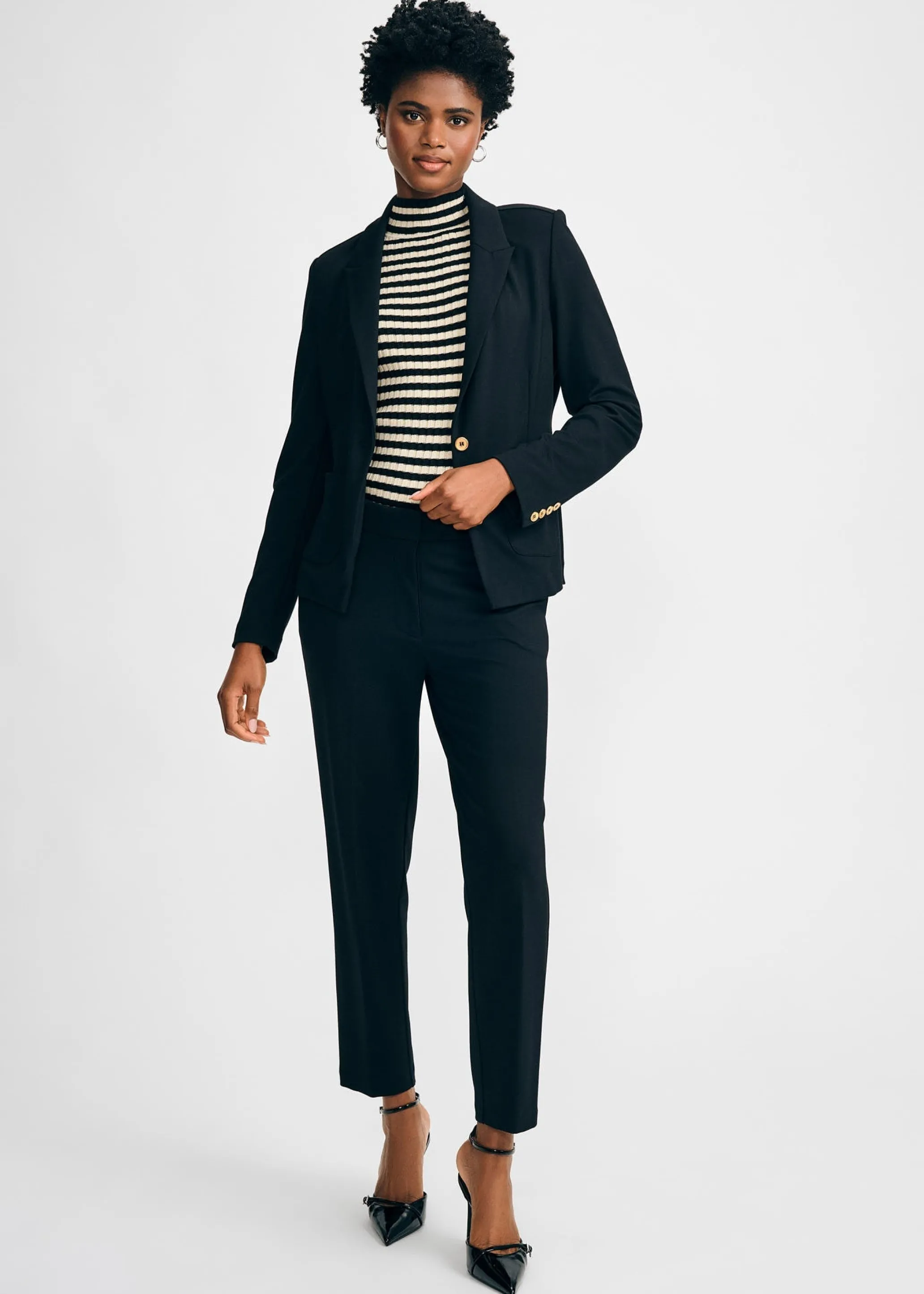 The Slim Straight Pant is the essence of refined minimalism. These pants offer a sleek silhouette with a comfortable stretch, making them as practical as they are stylish. The clean lines and slim straight cut provide a tailored fit that effortlessly complements any look, from polished workwear to sophisticated evening ensembles.