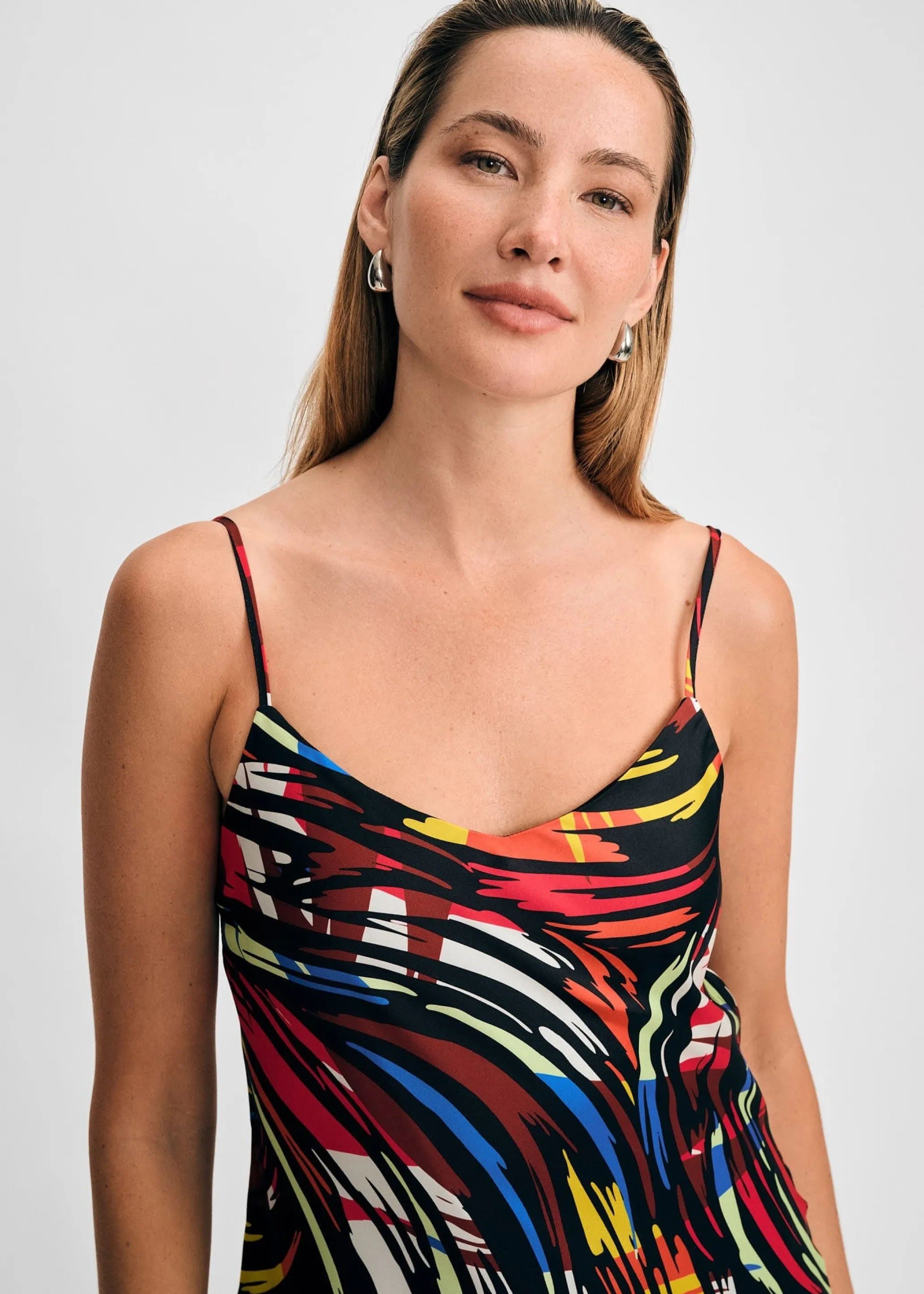 The Trim Strap Slip Dress showcases a bold statement with its vibrant Wild Zebra print. The sleek silhouette and delicate trim straps create a striking yet refined look, perfect for both day and evening wear.